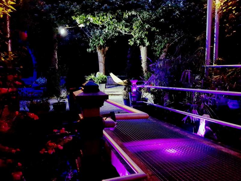 Porche privado sobre el estanque de peces exóticos con mobiliario de madera.